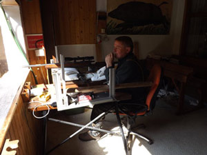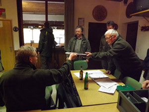 Weitaus wichtiger für Leib und Seele war die „Feldküche“, die in bewährter Manier von Dietrich Fingerhut und Tim Förster besetzt war! Gegen Ende des frühsommerlichen Jagdtages erfreute sich dieser Hort stärkeren Zuspruchs, als die Schießstände. Höchste Zeit für unseren Hegeringleiter Norbert Polzer, zum symbolischen Abschluß zu trommeln: Es wurde die obligatorische Ehrenscheibe – diesmal ein Auerhahn - ausgeschossen! Dabei zeigten die beiden Jagd- und Bläserfreunde Jürgen und Manfred Arnold auch durch die Lage ihrer Schußlöcher, wie nahe sie sich stehen J. Der mit angestrengtem Blick auf die Schußlöcher geführten Diskussion, wer der beiden Arnolde nun denn die Ehrenscheibe mit nach Hause nehmen dürfe, machte kurzerhand Reinhold Werner mit seinem Treffer ins Zentrum ein Ende! Mit dessen Ehrenrunde klang an der Theke der Feldküche der erste Schießtag des Hegerings Battenberg in sehr jagdkameradschaftlicher Atmosphäre aus.