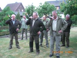 Vereinskameraden JOSEF KOCAB zum 90. Geburtstag zu überraschen. Nach der heimlichen Aufstellung der Bläser im Garten des Jubilars wurde Josef K. vom Sohn Dieter in den Garten geholt und die Überraschung war sichtlich gelungen. Es wurden die Begrüßung - der Festmarsch und das Totsignal des Rothirsches geblasen ! Nach Dankesworten des sichtlich überwältigten Jubilars wurden die Akteure zu einem kleinen Umtrunk in das Jagdzimmer geladen und es wurde eine überaus gemütliche Festrunde mit Herrn Josef Kocab verbracht.