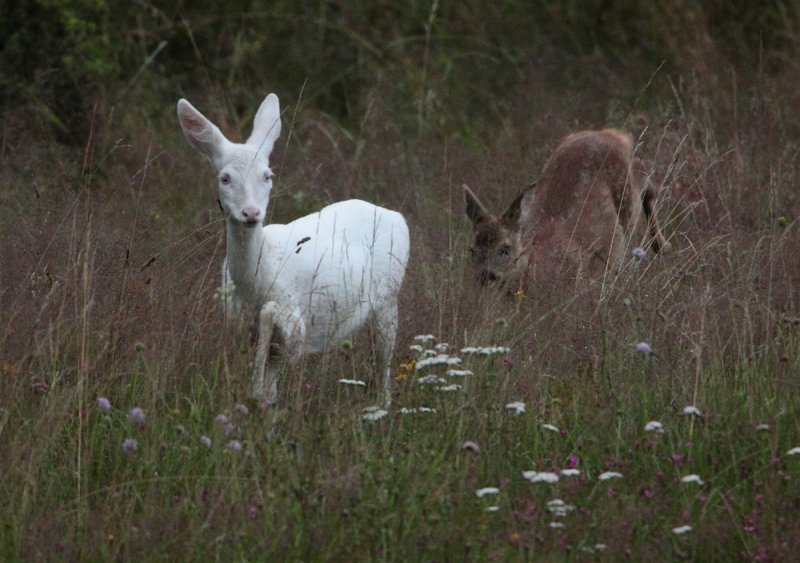 Foto: Dieses verborgen im Kreisteil Frankenberg lebende Albino-Reh setzte in diesem Jahr ihr erstes Kitz. Es ist braun und folgt jetzt seiner Mutter, der Ricke, auf Schritt und Tritt. Foto: G. Kalden