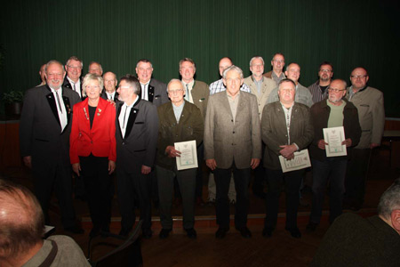 Frankenberg. Viel Lob nicht nur für den Bericht des Präsidenten des Deutschen Jagdschutzverbandes, Hartwig Fischer, gab es am Freitagabend in der Ederberglandhalle anlässlich der Jahreshauptversammlung der Jägervereinigung Frankenberg, sondern auch für gute Prüfungsergebnisse bei der Jägerprüfung. Außerdem konnten sich nicht wenige Jäger eine Ehrennadel ans Revers heften lassen. Die Ehrennadel für 25 Jahre Mitgliedschaft in der Jägervereinigung erhielten Manfred Albus, Christian Borowy, Herrmann Büchsenschütz-Göbeler, Gisela Ellinghaus, Peter Engel, Martin Finger, Martin Hecker, Ernst Kimmeskamp und Frank Wiegand. Für 40 Jahre Mitgliedschaft wurden mit einer Ehrennadel geehrt: Günter Born, Karl Born, Dietrich Emde, Heinz Engel, Günter Finger, Helmut Gerke, Heinz Richardt, Uwe Rudersdorf, Karl Ruhwedel, Adrian Vogel und Helmut Weigel. Manfred Hecker erhielt die Ehrennadel für 50 Jahre Mitgliedschaft und Heinrich Schmidt für 60 Jahre.