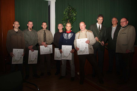 Die Jungjäger (v.links) Patric Spallek, Nicolai Klein, Stefan Ritter, Victor Helfrich, Daniel Möller und Thorsten Spallek erhielten den Jägerbrief aus den Händen von (v.li.) Thomas Figge (Obmann der Jägerausbildung), Heinrich Engelhard (1.Vorsitzender) und Hans Ammenwerth ( bisheriger Vorsitzender, jetzt Schriftführer). Auf dem Foto fehlen Julia Pleger und Renate Scheibe.