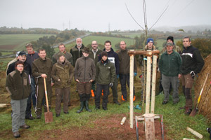 In einer gemeinsamen Aktion pflanzten am Samstag Jäger und NABU-Mitglieder alte Apfelbaumsorten nahe der alten Geismarerstraße unter Anleitung von Martin Hecker, ganz links im Bild, daneben Reinhard Brandl und Forstamtsleiter Andreas Schmitt. Foto: G. Kalden